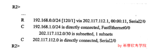 在路由器R2上采用命令(28)得到如下圖所示結果。PC1可能的口地址為(29),路由器R2的SO口的IP地址為(30)。若在PCl上查看主機的路由表,采用的命令為(31)。