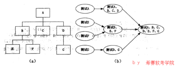 ●下圖(a)所示為一個模塊層次結構的例子,圖(b)所示為對其進行集成測試的順序,則此測試采用了(34)測試策略。該測試策略的優點不包括(35)。