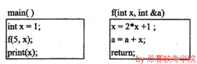 ●函數main()、f()的定義如下所示,調用函數f()時,第一個參數采用傳值(call by value)方式,第二個參數采用傳引用(call by reference)方式,main函數中“print(x)”執行后輸出的值為(50)。