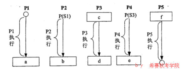 若用PV操作控制進程P1、P2、P3、P4和P5并發執行的過程,則需要設置5個信號S1、S2、S3、S4和S5,且信號量S1~S5的初值都等于零。下圖中a和b處應分別填(26);c和d處應分別填寫(27);e和f處應分別填寫(28)。