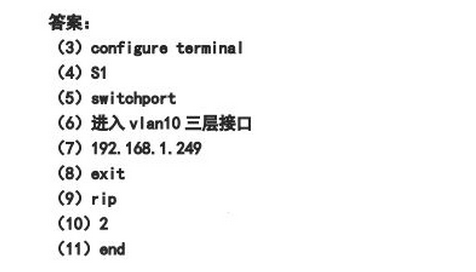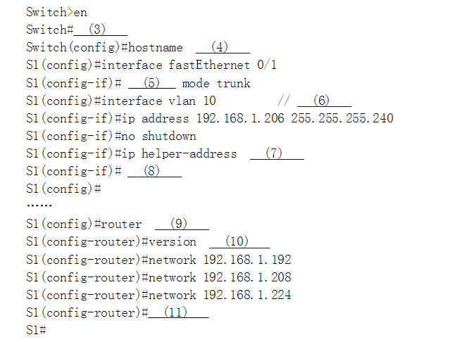 將公司內(nèi)部用戶按照部門分別劃分在3各vlan中:vlan10,vlan20和vlan30。均連接在交換機(jī)S1上,并通過S1實(shí)現(xiàn)vlan間通信,所有內(nèi)網(wǎng)主機(jī)均采用DHCP獲取IP地址。按照要求補(bǔ)充完成(或解釋)以下配置命令。