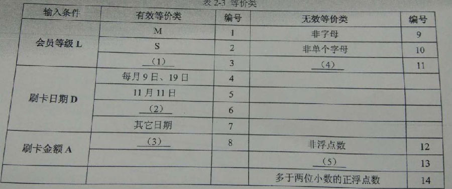 根據以上等價類表設計的測試用例如下表所示,請補充表2-4中空( )~( )