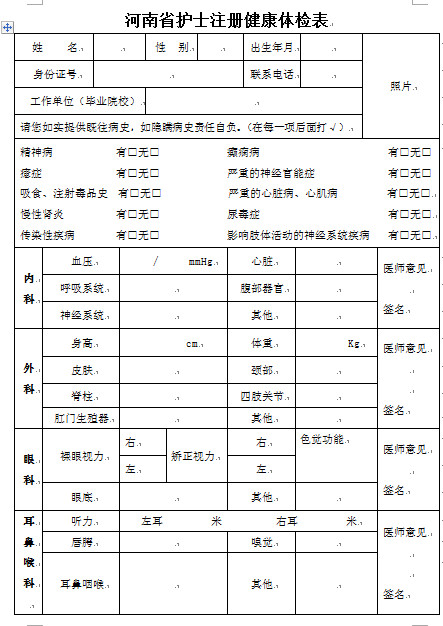 2018年河南護士注冊健康體檢表格式如下: